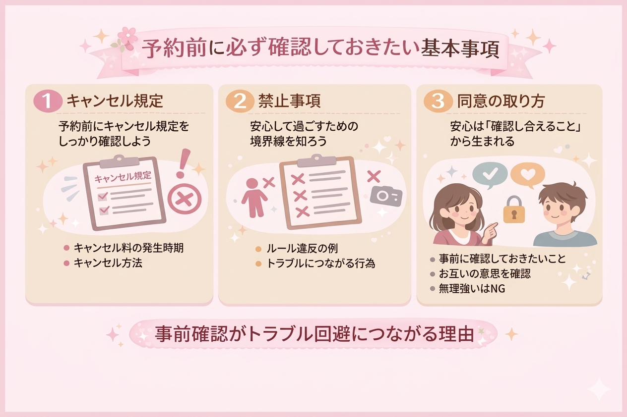一方で、予約前にルールを理解しておけば、何かあった場合でも落ち着いて対応しやすくなります。