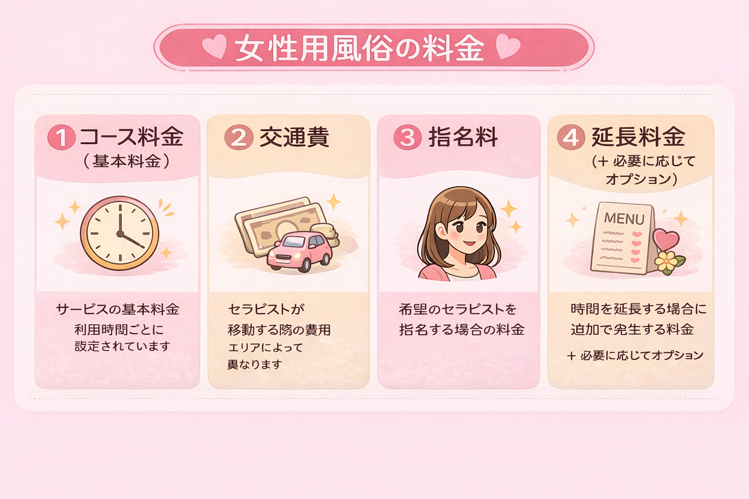 多くの女性用風俗では、料金は次の「4つのパーツ」を組み合わせて考えます。